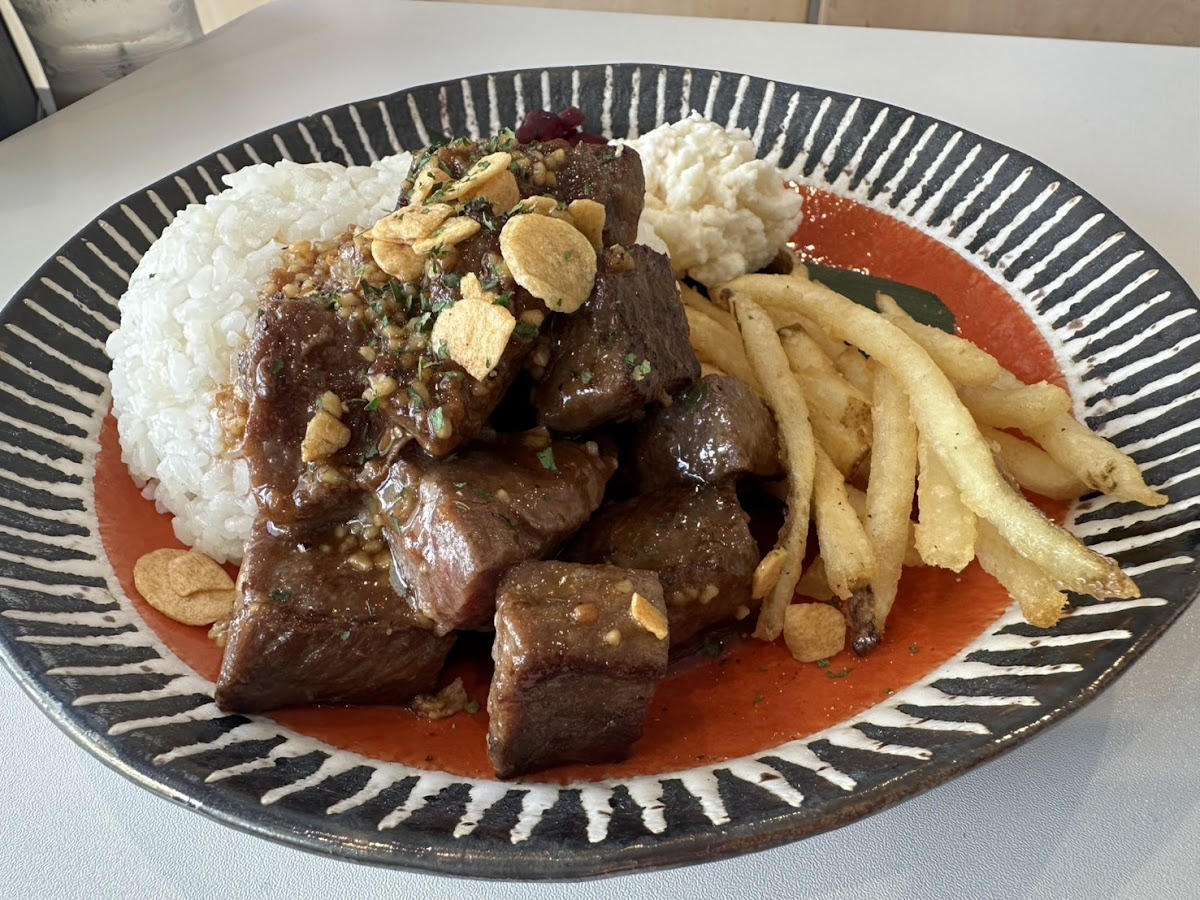 For meat lovers, the Garlic Cubed Beef Steak (¥1,880) is a must-try. Tender pieces of beef drenched in a savory garlic steak sauce will satisfy even the heartiest of appetites. Not one to choose between shrimp and beef? Indulge in the Cubed Beef Steak & Garlic Shrimp Combo (¥2,480), a fantastic dish that gives you the best of both worlds, complete with crispy fries, refreshing potato salad, and pickles for a well-rounded meal.